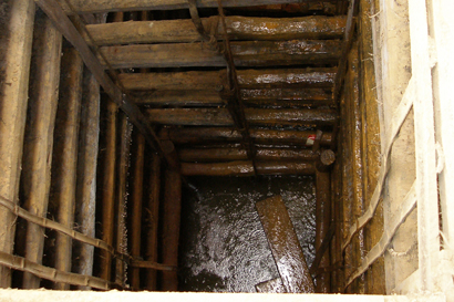 At a mine in Ratnapura looking down the mine shaft. Much less nerve-racking in the picture than in person, trust us. The shaft reaches down to the gem bearing gravel layer (illam) which can vary in depth from 2 to 20 meters. The shaft is reinforced with timbers that the miners scurry up an down. The minining often spreads laterally from the shaft for several meters, parallel to the top surface. The pump house is just on top of the shaft which pumps up the ever present accumulated water.