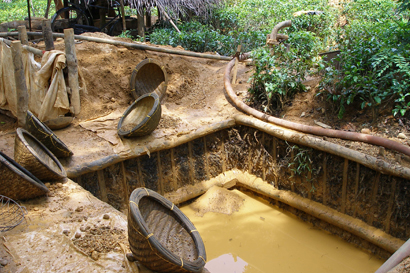 Once raised to the surface, the gem-bearing gravels are very carefully washed in the pit shown here. Material is placed in these triangular baskets and carefuly sifted in the water pumped up from the shaft. The trained-eye will catch the glimmer of the ellusive "blues" or other stones that catch the sunlight.